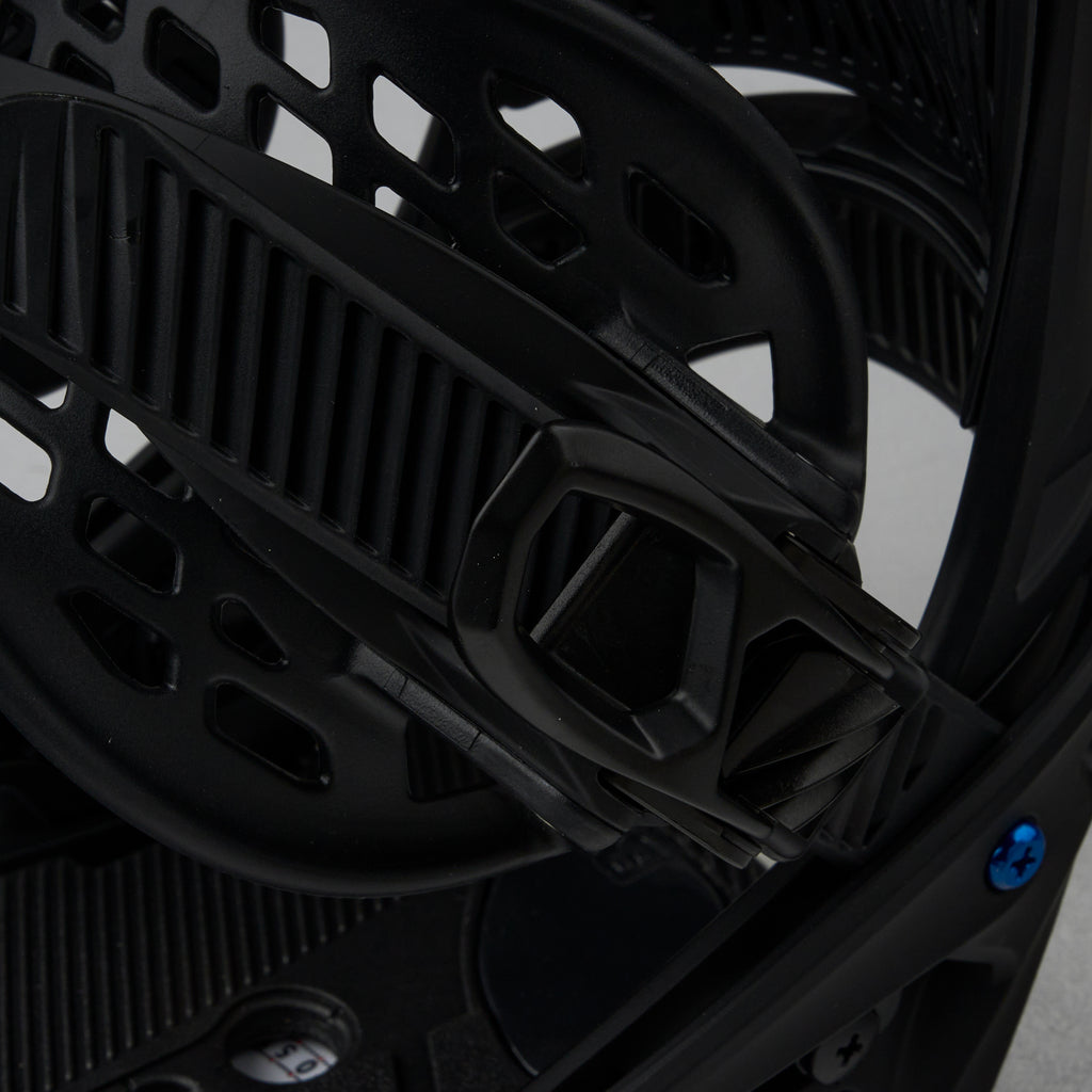 The Burton Genesis EST is a top-end binding that performs with a focus on comfort. Often thought of as one of the stiffest bindings that Burton makes, when it's actually more flexible compared to the Burton Cartel X. The additional flex is most noticeable from the built-in suspension. The highback wraps to the shape of your boot, which creates comfort since you're not leaning into a hard highback but does increase responsiveness because your boot can't slide up. Other features help align your leg properly for a stronger direct connection to the board with less of a roll or strain on the knee. Both toe and ankle straps are stitchless for max durability and a perfect fit that cradles the boot perfectly. While the Burton EST system is only compatible with the Burton Channel System, the perks of EST are pretty great. The Hinge System makes a noticeable difference by reducing the binding footprint on the board for vibration absorption and natural board flex, the ability for the binding and board to work together while under tension reduces foot fatigue and overall connection to the board. The Burton Genesis EST is lightweight, crazy comfortable, and can handle aggressive riding. It's simply one of Burton's best and a team favorite.