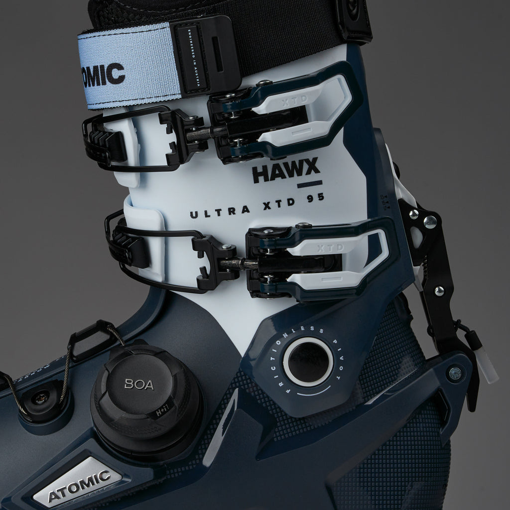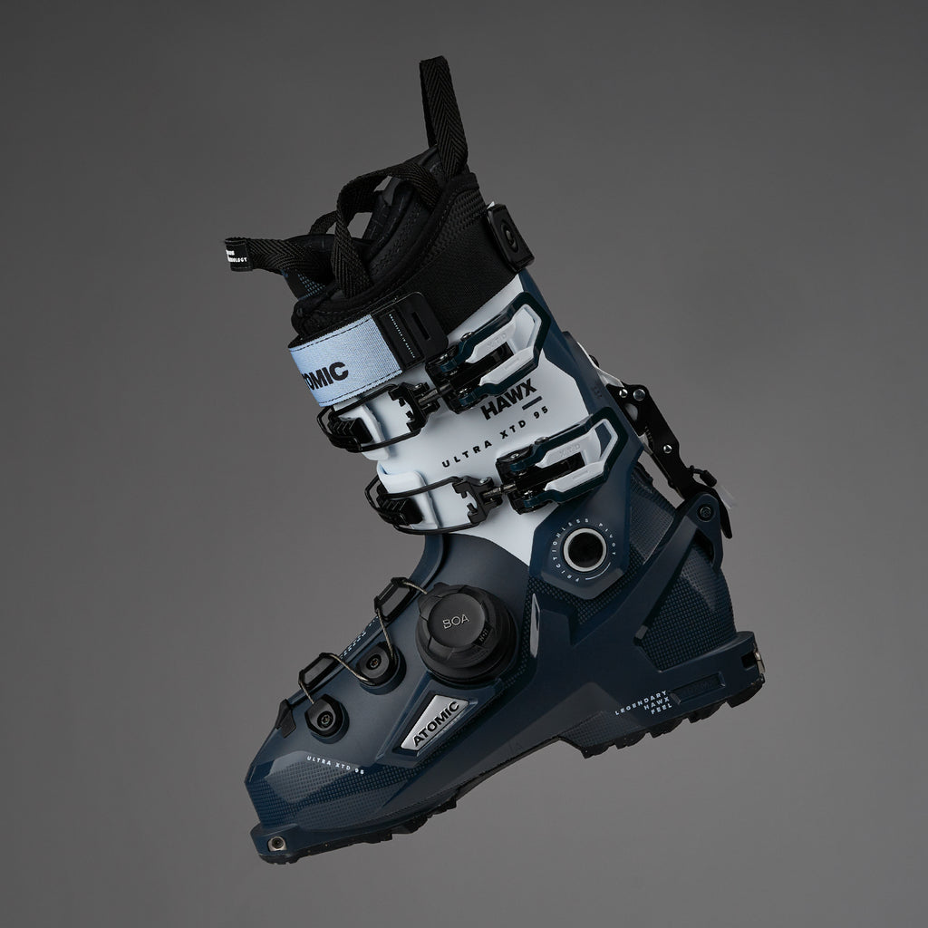 The Atomic Hawx Ultra XTD 95 BOA is one of our favorite alpine touring options for this season. It shares nearly all of the fit characteristics of the regular Hawx Ultra 95, it just has a walk mode and tech toes allowing it to be used outside of the resort. The Ultra XTD 95 BOA is a low volume boot, great for skiers with more narrow feet or those who want a more locked in feel. The 95 flex is more than enough boot for intermediate skiers who don't need the stiffest flex out there while also being forgiving enough for less experienced skiers who are making the jump from rental boots or entry-level ski boots. The Ultra XTD 95 drives most recreational skis predictably and has a nice level of responsiveness. If you are a more touring-oriented skier, this boot paired with a lighter-weight touring ski will allow you to pivot and drive those skis incredibly easily, even on steeper or more technical terrain. The walk mode is smooth and easy to use which will allow for a more natural feel on ascents during touring days. The BOA system on the boot also helps to take the fit to a new level by helping to wrap the mid and forefoot evenly without cranking the boot on top of the foot.