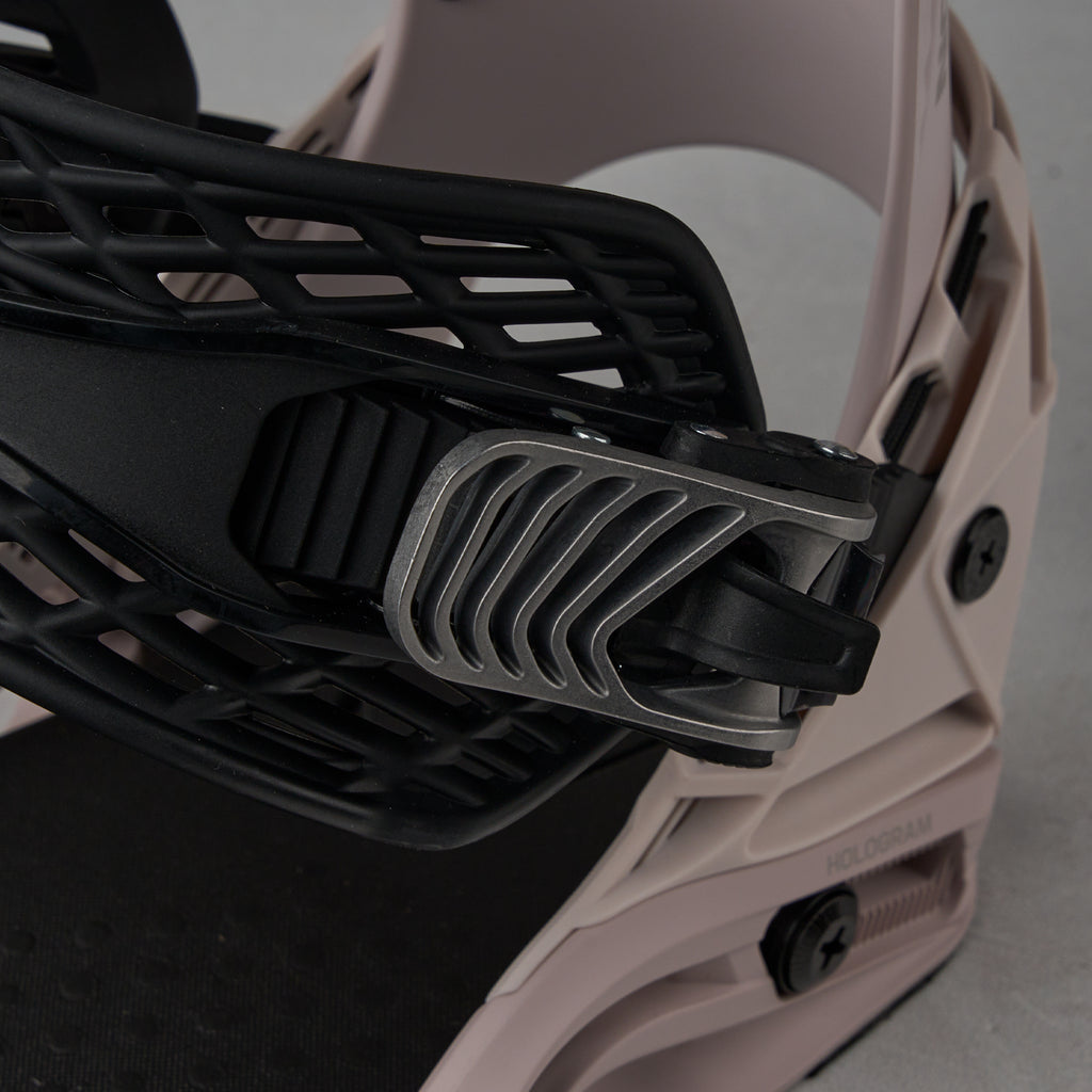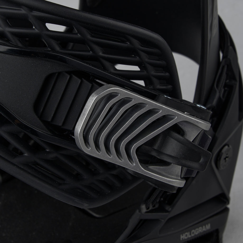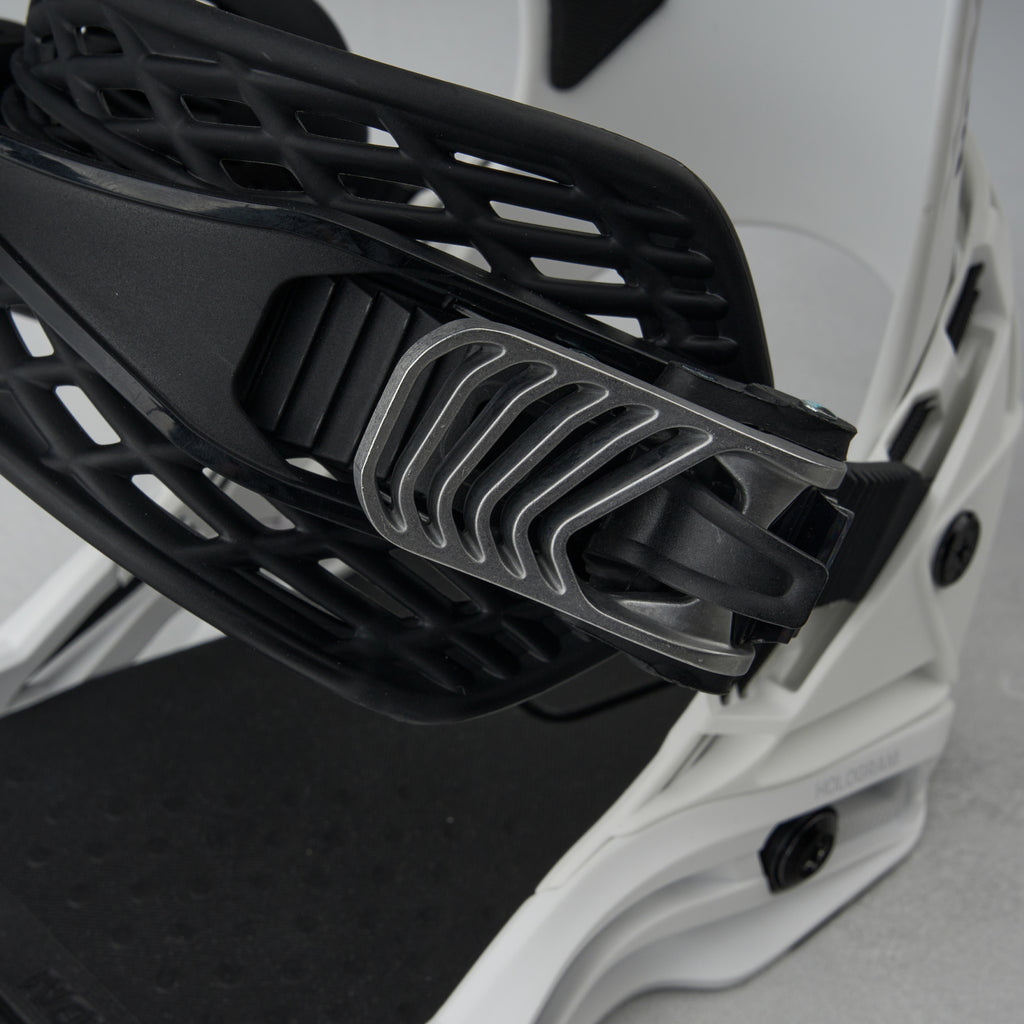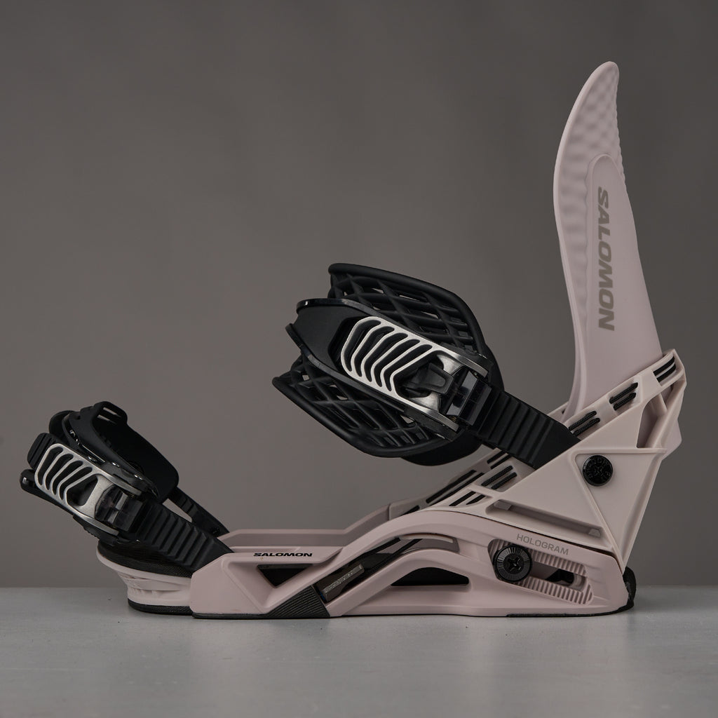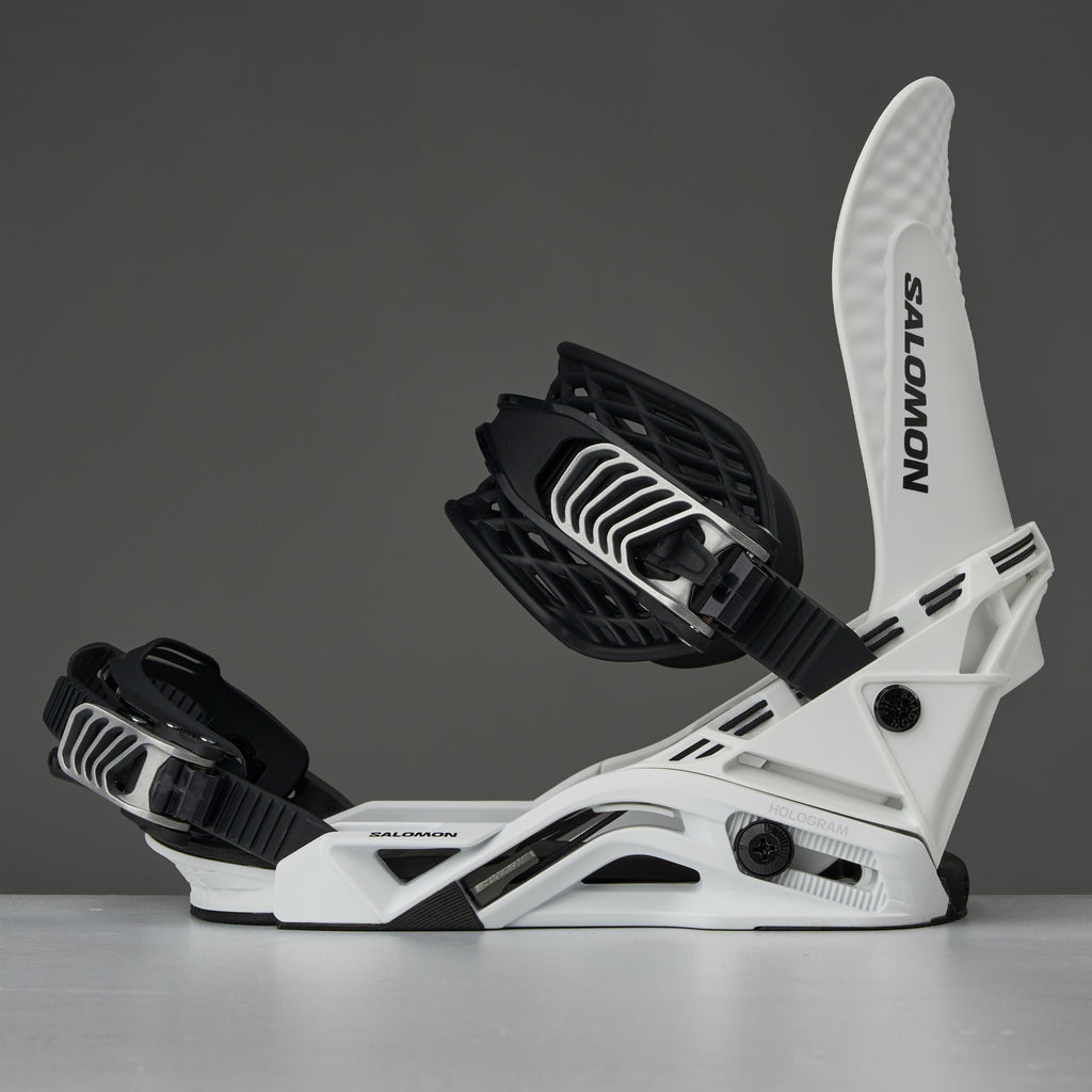 The Salomon Hologram is one of the smoothest bindings out there. It stands out among other bindings because of the way it wraps your heel and locks you in. A lightweight heelhoop paired with a Kevlar QuickWire wraps the entire heel of the binding, making it so your heel is locked in, this maximizes endurance and performance. Because it locks your heel so well, it feels incredibly smooth and consistent. The binding offers a unique combination of control, responsiveness, and mobility while maximizing comfort. A medium-stiff flex puts it a little more on the responsive side, so this binding wants a rider who can drive a snowboard. It's not the stiffest binding out there, but it can definitely handle some harder charging with ease. The highback generates plenty of power and makes you feel in control. Whether it’s freestyle, freeride, groomers, bowls, or trees you're looking to do, the Hologram will take you there.
