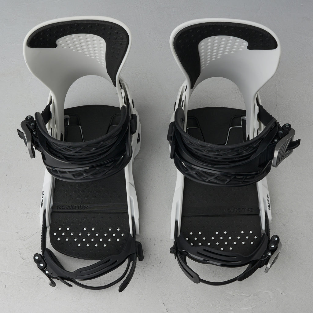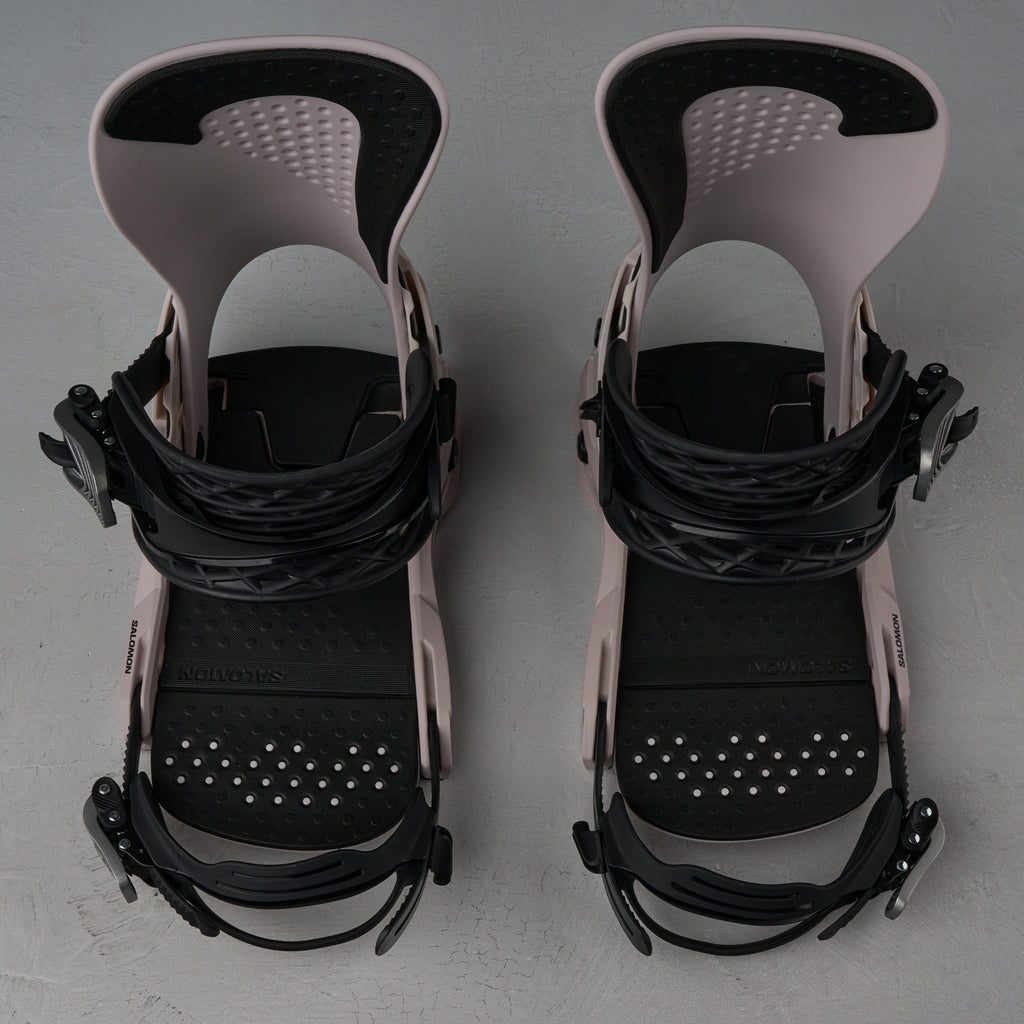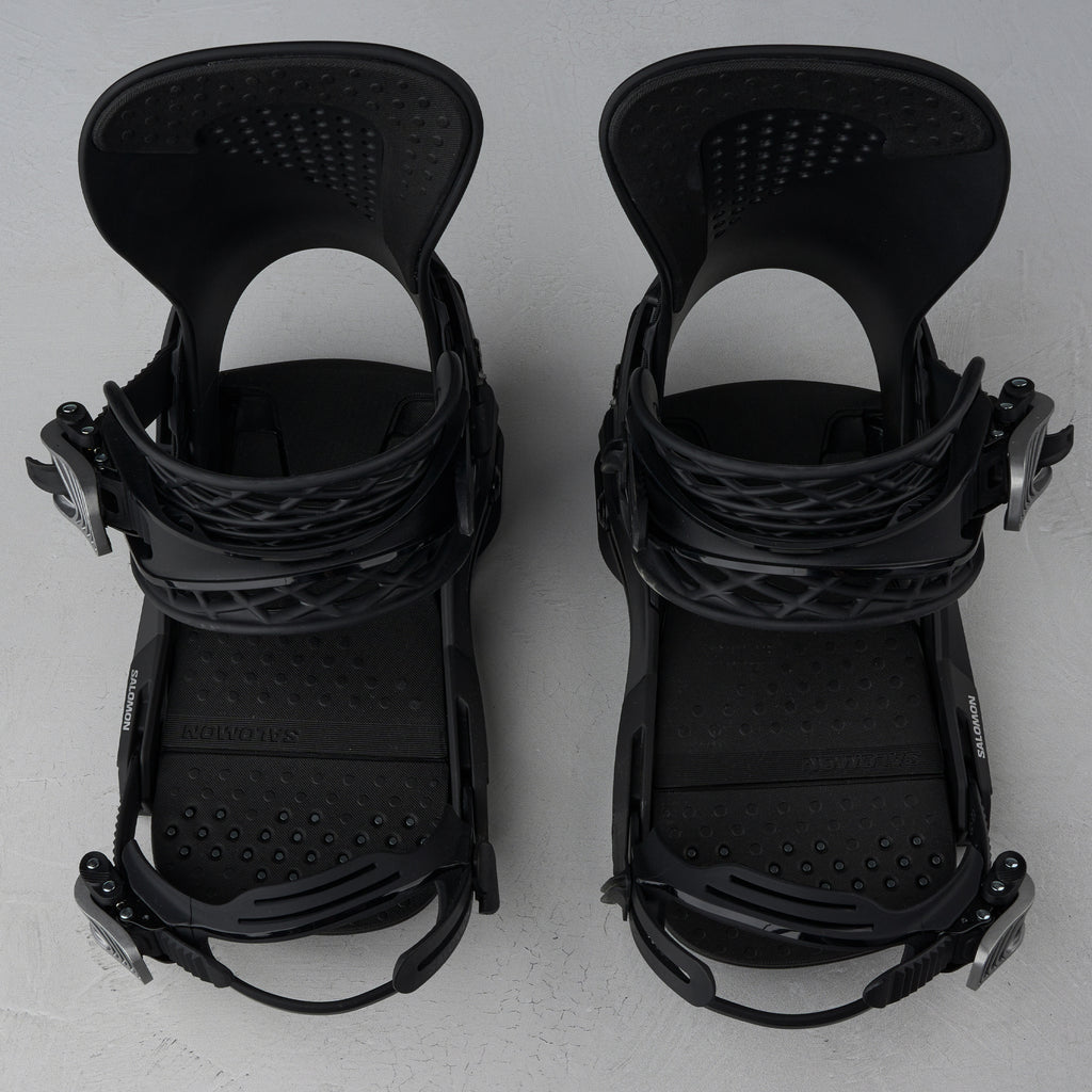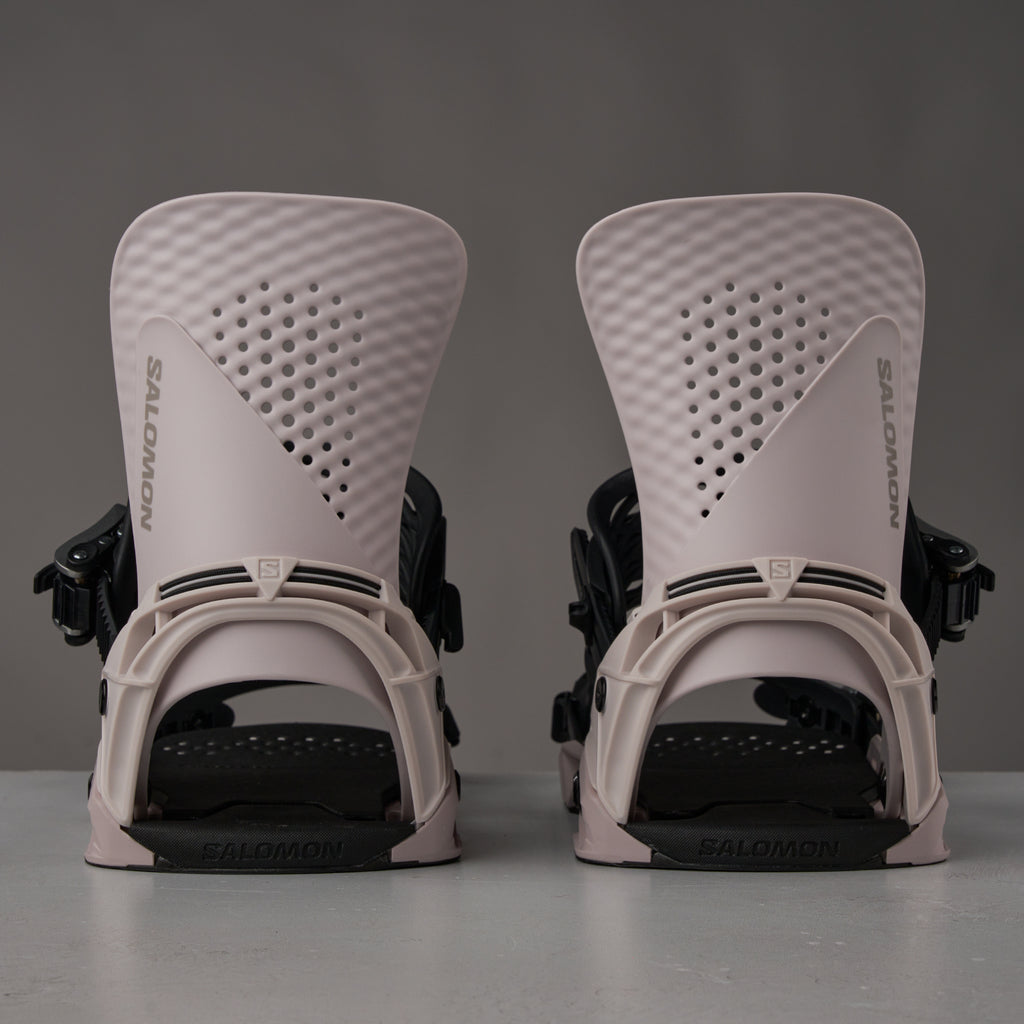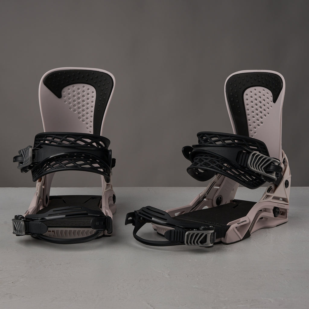 The Salomon Hologram is one of the smoothest bindings out there. It stands out among other bindings because of the way it wraps your heel and locks you in. A lightweight heelhoop paired with a Kevlar QuickWire wraps the entire heel of the binding, making it so your heel is locked in, this maximizes endurance and performance. Because it locks your heel so well, it feels incredibly smooth and consistent. The binding offers a unique combination of control, responsiveness, and mobility while maximizing comfort. A medium-stiff flex puts it a little more on the responsive side, so this binding wants a rider who can drive a snowboard. It's not the stiffest binding out there, but it can definitely handle some harder charging with ease. The highback generates plenty of power and makes you feel in control. Whether it’s freestyle, freeride, groomers, bowls, or trees you're looking to do, the Hologram will take you there.