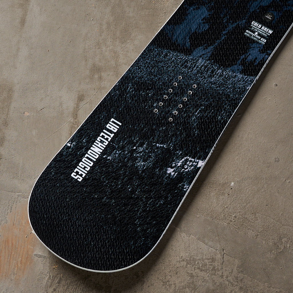 The Lib Tech Cold Brew is a freeride board that suits a range of riding styles, from seasoned freeriders to newer riders who are still figuring it out. If you're an experienced snowboarder who rides all over the mountain and prioritizes the ability to jump, jib, ollie, and press, this is one of your best options. It loves that kind of riding but doesn't veer too far into the "park board" category. A medium flex pattern gives it a ton of pop and a more playful feel so, so boosting side hits or weaving through the trees or around various obstacles takes nothing. The easygoing feel also makes it accessible for progressing riders; it's lightweight, balanced, and easy to turn. Checks all the boxes for someone just learning to snowboard. The board's shape adopts Lib Tech's C2 camber design, which essentially translates to reverse camber. Reverse camber creates more energy throughout the board, allowing it to turn and pivot quicker than a traditional camber board. It's a great design for technical terrain and low-speed accessibility. The sacrifice with this shape is that it doesn't grip as well as a camber shape board on firm snow, and this becomes more noticeable the faster you're going. If aggressive hard snow performance is the most important thing to you, you're looking at the wrong board. The Cold Brew is designed for easy turning, getting creative, and bringing a playful style to wherever the mountain takes you.