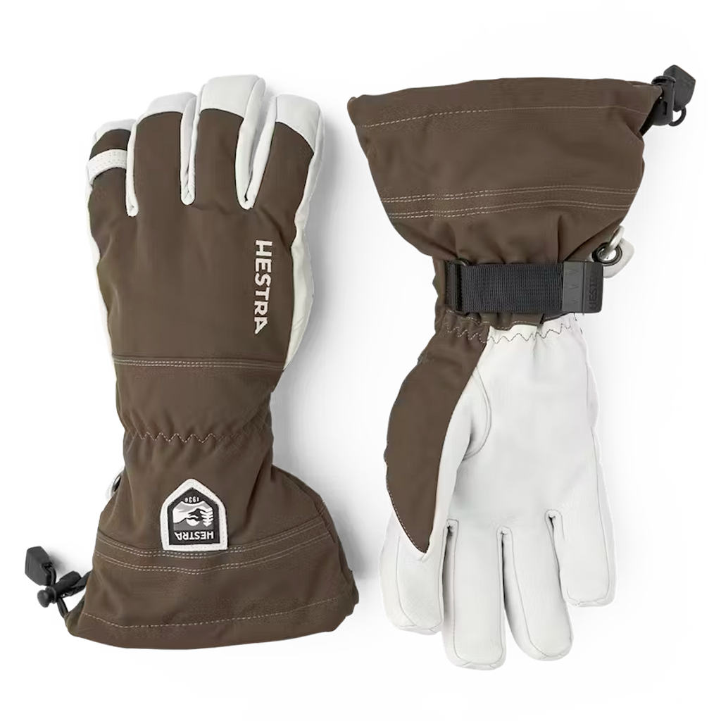 The Army Leather Heli Ski Glove is a Hestra classic thats been a proven winner for years. The army goat leather combined with the Hestra Triton polyamide fabric provides for a super durable and windproof mitten that will keep you warm and dry. Insulated with the G-loft for additional warmth, and the lining is totally removable if you need to air out the mitten after a day of skiing powder. The long cuffs keep snow out of your sleeves and the wrist straps prevent you from dropping the mitt when texting on the chairlift.
