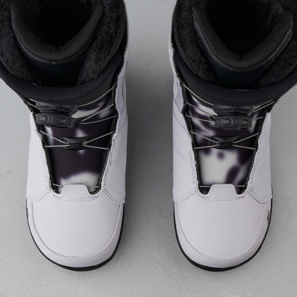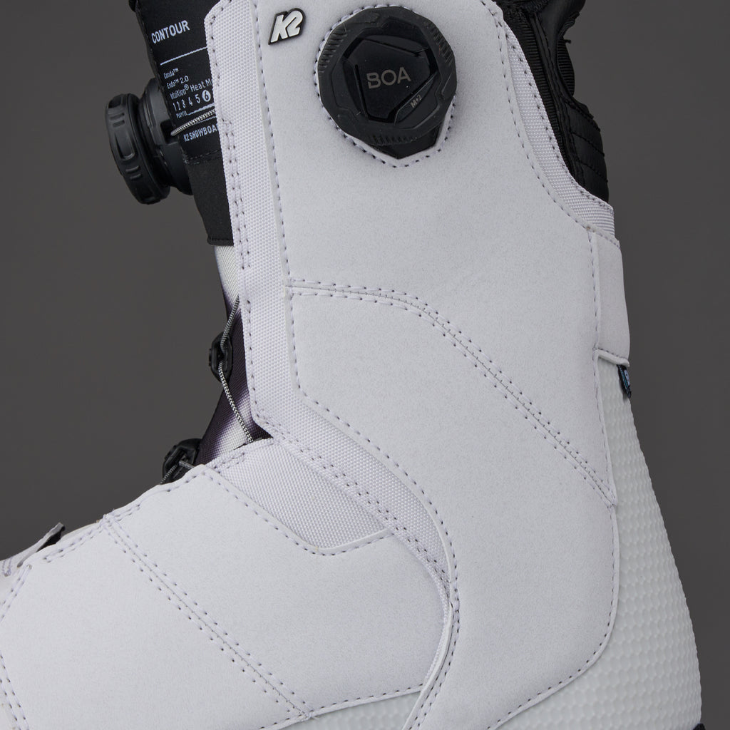 The Contour is a rippin' ladies boot that's an absolute favorite year after year because of its combination of comfort and performance. It's a stiffer option that's ready to handle a rider who knows how to flex into a boot. It's great for advanced riders who like to ride fast and want a responsive boot but isn't so stiff that it's inaccessible to intermediate-level riders. Beginner riders should check out something softer, like a K2 Kinsley, but anybody looking for a more supportive and stable boot will prefer the Contour. The Conda double BOA lacing system allows for a dialed fit that adds to the responsive personality that you'll appreciate on steep, gnarly terrain. Conda is an inner lacing system powered by your side BOA dial that wraps the top of your foot and pulls your heel back into the boot's heel pocket. Externally, an articulating cuff reduces distortion when bending the knee. From pro-riders to everyday rippers, the K2 Contour Snowboard Boots are a favorite every year.