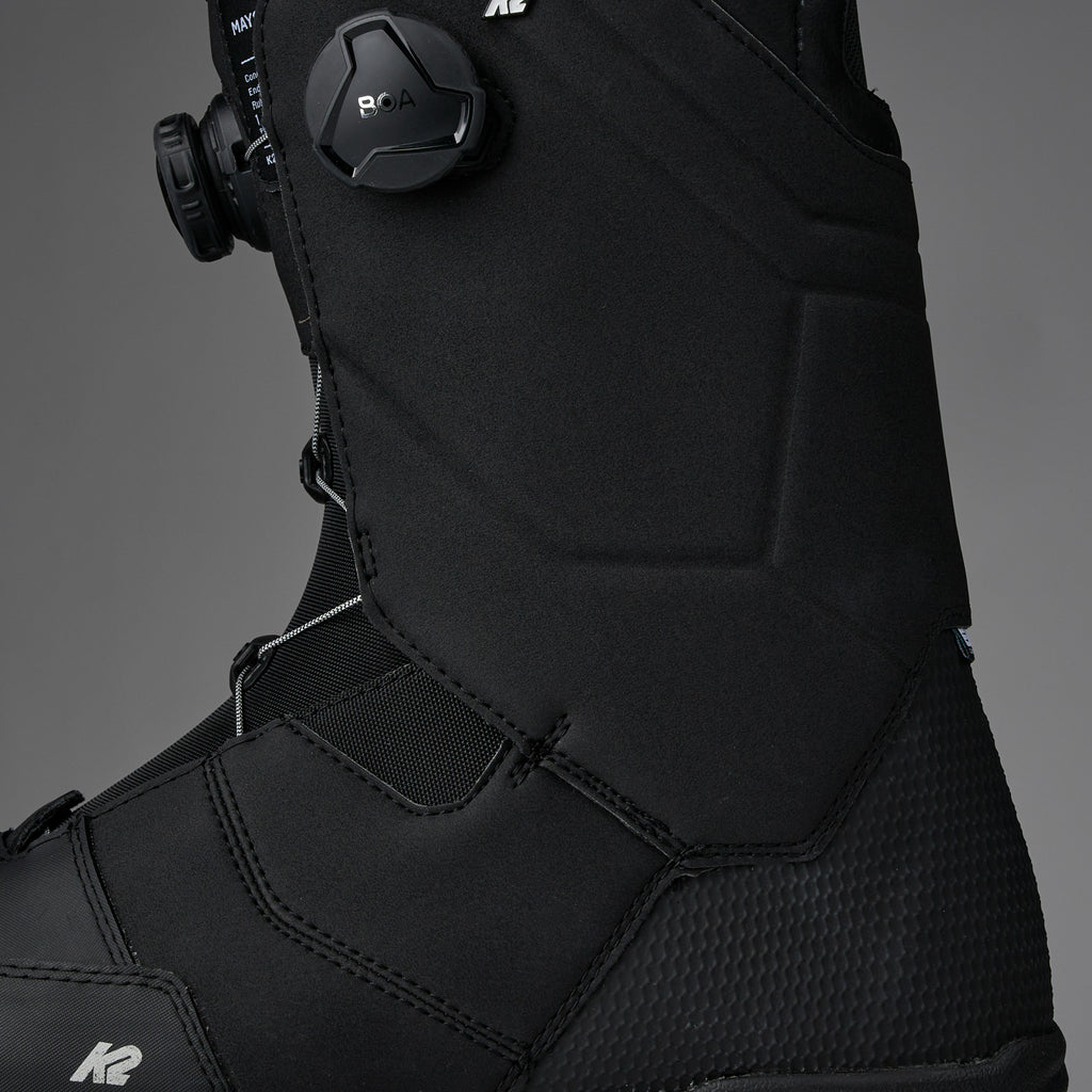 The reason any rider, even ones with narrow feet, can get down with the Maysis is because of the way the Double BOA system is designed. The Conda system from K2 gives the boot the ability to lock down any dogs. The function of the front BOA is pretty standard, it controls all the laces on the outside of the boot, but the side BOA is going to control the Conda system, which is an internal harness that wraps your instep and hugs your ankle for maximum heel hold control. The tighter you go on the side BOA, the tighter the Conda gets, and the more locked in your ankle. The Maysis is one of our most popular boots because it makes sense for so many riders. No matter your foot shape, the mid-stiff boot provides a responsive feel and is ready to take on whatever you throw at it.