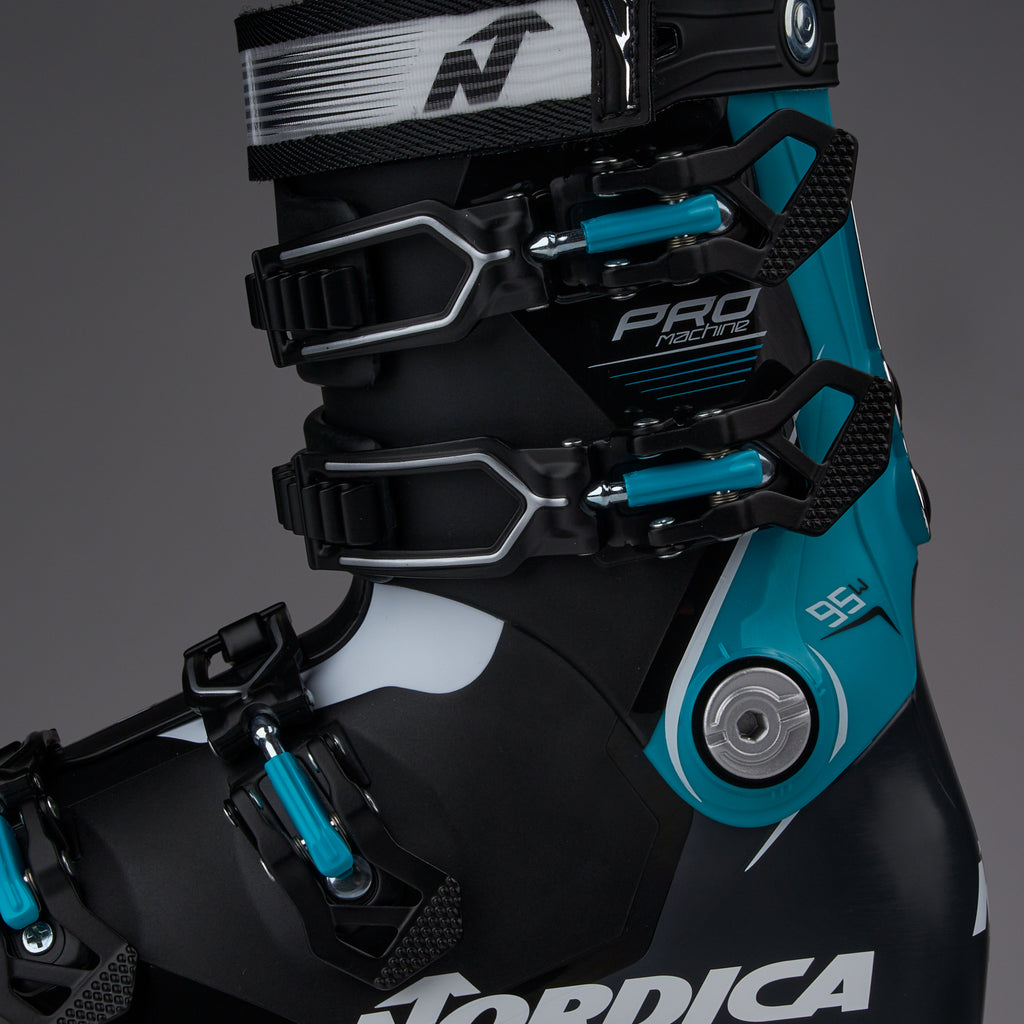 The Nordica ProMahcine 95 is a low volume, for narrow feet, at a flex rating great for skiers making the jump out of rental boots or those who don't need to be in the stiffest boot out there. At a 95 flex this boot has a responsive feel and will make you feel more confident in your skiing. It has good rebound which means your legs will have to do less work to get the skis to go where you want them to. Even though these are a more narrow boot with a precise fit, they are not difficult to put on and they have a good level of comfort. If you want/need a more powerful and responsive boot, check out the ProMachine 105.