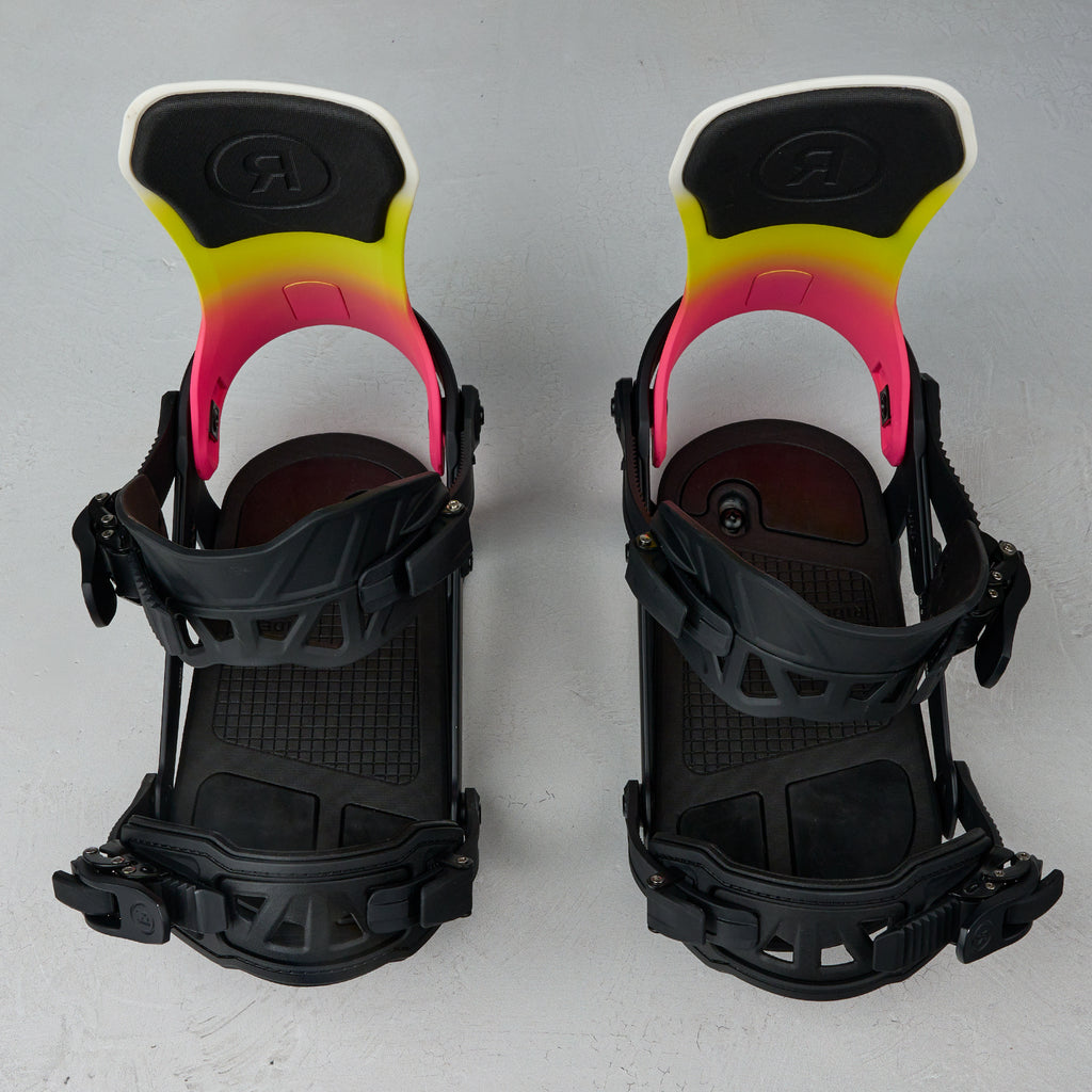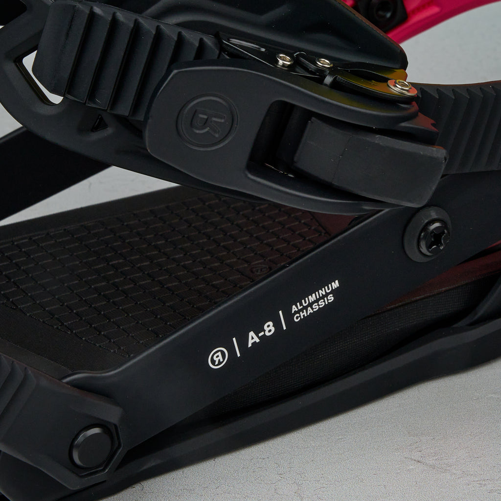 This favorite from Ride is back for another year and looking sicker than ever. I know we like to pretend looks don't matter with snowboard gear but look how clean that thing looks, it's at least an added bonus if it fits your riding style. Snowboarders looking to take their shredding to the next level and go faster along with riders who are already at the level will instantly appreciate the power that the A-8 brings to the hill. Ride keeps it super easy and digestible with their naming. The first letter is an abbreviation for the chassis material, and the number is a flex rating. So in the case of this binding, A-8 means you have an aluminum chassis and a flex rating of 8. That combo makes for a super powerful binding that's going to feel more responsive compared to a softer material as you shift from your toe edge to your heel edge. So if charging hard is your style, the Ride A-8 delivers. The cored Nylon highback also contributes additional power and responsiveness at speed, with stitch-less straps and canted footbeds topping it off with added comfort and control. The Ride A-8 is ideal for strong snowboarders who like big carves and getting down the hill in a hurry.