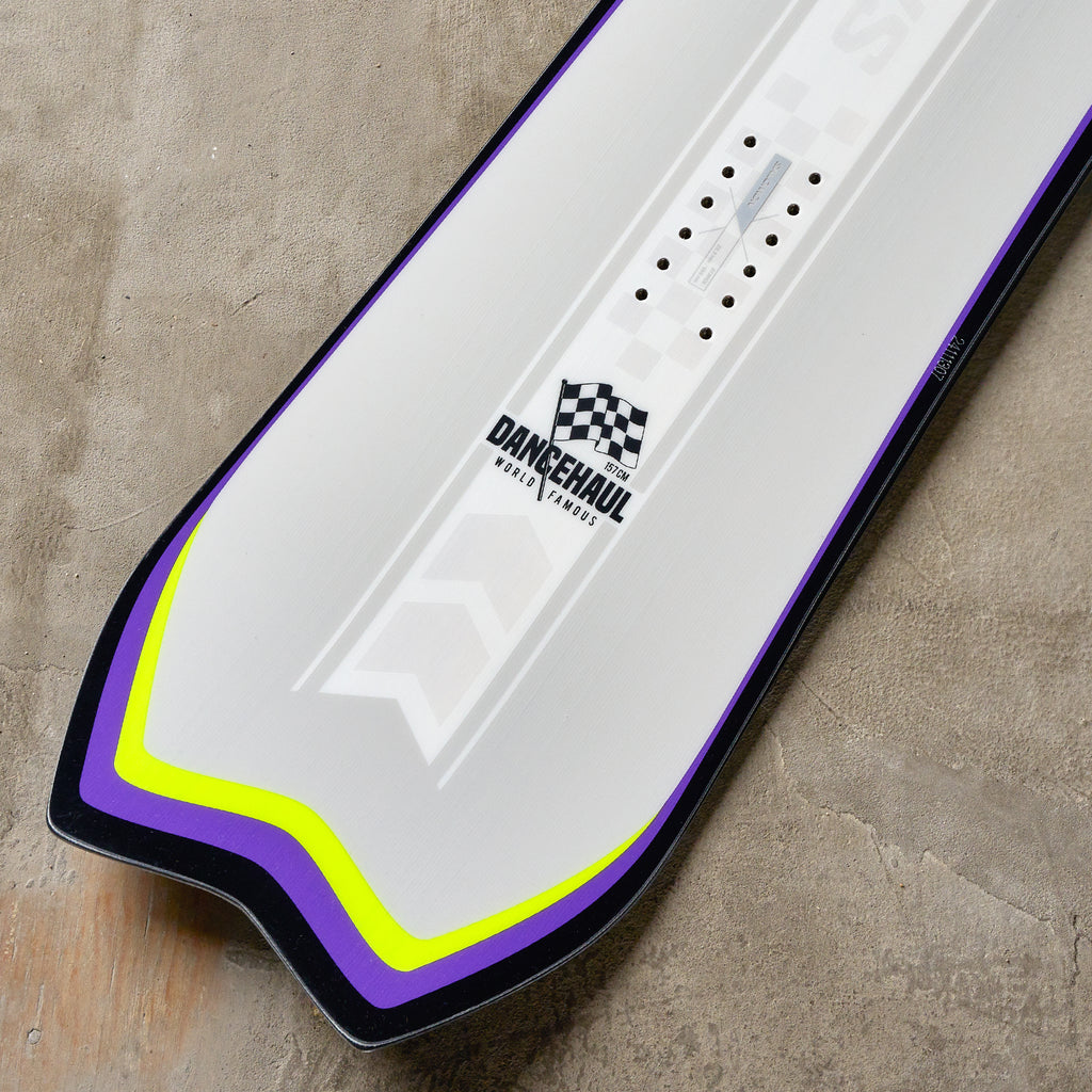 As the name implies this board wants to dance. With a shorter and wider directional shape, a long nose, and a fishtail, the shape is pretty unique compared to most standard all-mountain boards out there. First things first, DO NOT LET THE SHAPE SCARE YOU. I think a lot of people see a board with a shape like this and think it must be specialized to a specific riding style other than their own, not the case. A lot of our favorite boards; the Burton Deep Thinker, the K2 Excavator, and of course the Dancehaul share this unique directional shape and are all plenty versatile. The Dancehaul is a mid-flex all-mountain board that's approachable and would be a great choice for a lot of riders. A setback stance and big nose make it sweet in soft snow, and a camber shape, mid-flex, and rockered nose make groomers a blast.